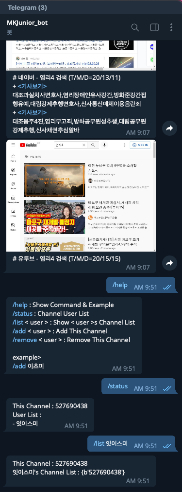 - Telegram 대화방에서 MKJunior_bot 을 통해 검색조건을 입력